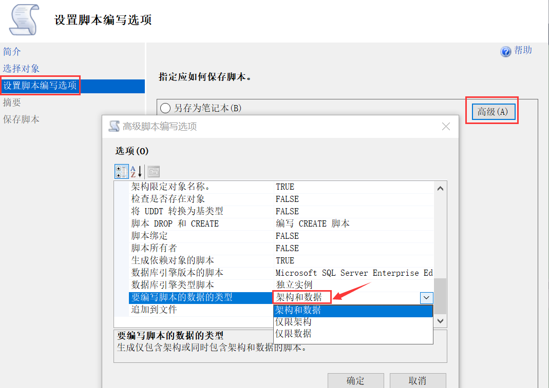 下一步,选择为整个数据库及所有数据库对象编写脚本(E),下一步,点击高级,下拉,找到要编写脚本的数据的类型,选择架构和数据;